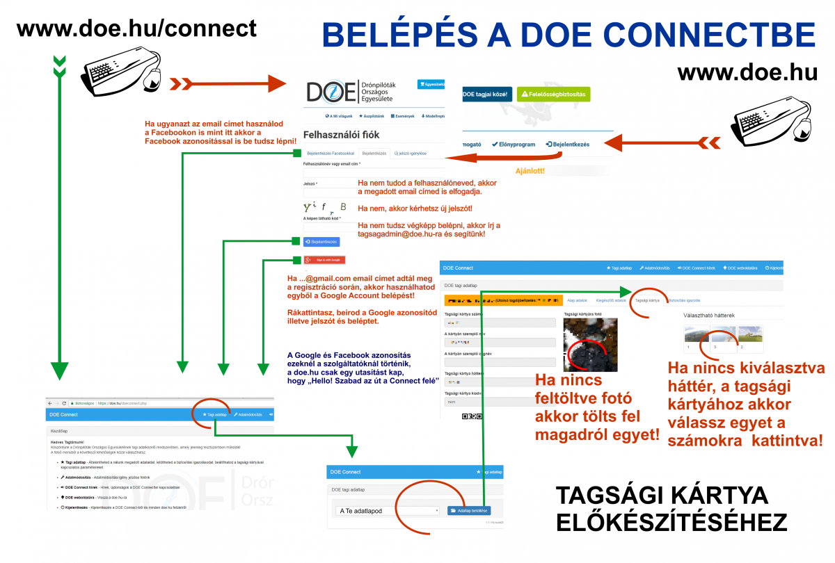 - A https://doe.hu/user oldalon keresztül meglévő felhasználóként be lehet lépni Google vagy Facebook fiókkal is amennyiben ezeknél szintén a regisztrációs email maga az azonosító.